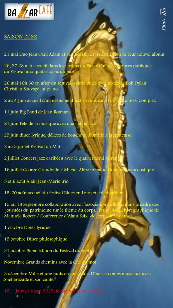 Nous avons créé avec Jérôme Saddier, grand serviteur de projets d’économie sociale et solidaire et résidant dans la région, une nouvelle association de gestion qui succédera à notre association Quai des arts, actuelle gestionnaire du lieu. Quai des arts demeurant le partenaire pour tout ce qui concerne les actions culturelles. Et nous comptons évidemment sur le soutien toujours fidèle de l’Association des Amis du Bazar Café.