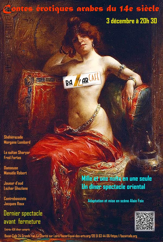 Un dîner spectacle oriental , musical, théâtral, chorégraphique et coquin avec Shéhérazade et le Sultan tiré des contes des mille et une nuits et du jardin parfumé.