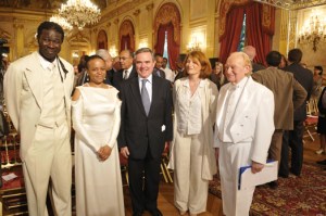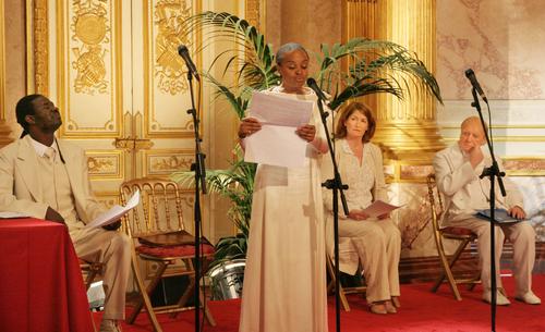 Bakary Sangaré de la comédie française, Muriel Mayette, administratrice générale de la Comédie-française, et Pierre Vial pour un hommage à Aimé Césaire.